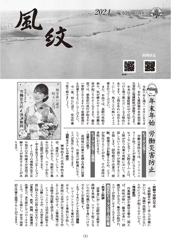2024年12月1日 / 最終更新日 : 2026年1月6日 ex 新着情報 風紋12月号(No,626)をアップしました! 風紋12月号を見る 社内報一覧ページを見る 弊社の社内報、風紋12月(No,626)をアップしました。 風紋12月号(No,626)ダイジェスト 年末年始 労働災害防止 建築施工研修 健康ワンポイント 世の中拝見 新丸山ダム視察 おいし~い♡レシピ 組合地域貢献 FacebookXBlueskyHatenaCopy