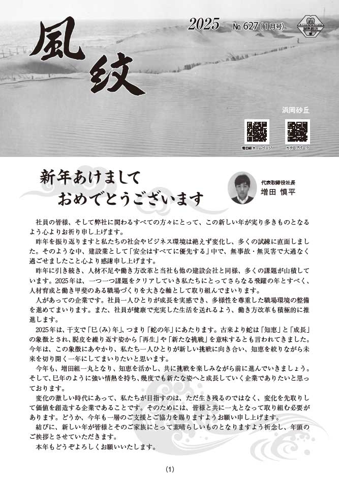 2025年1月1日 / 最終更新日 : 2026年1月6日 ex 新着情報 風紋1月号(No,627)をアップしました! 風紋1月号を見る 社内報一覧ページを見る 弊社の社内報、風紋1月(No,627)をアップしました。 風紋1月号(No,627)ダイジェスト 新年あけましておめでとうございます 安全衛生大会 健康ワンポイントアドバイス 新年の抱負 シアワセミライカイギⅡ 役員パトロール 救命講習 FacebookXBlueskyHatenaCopy