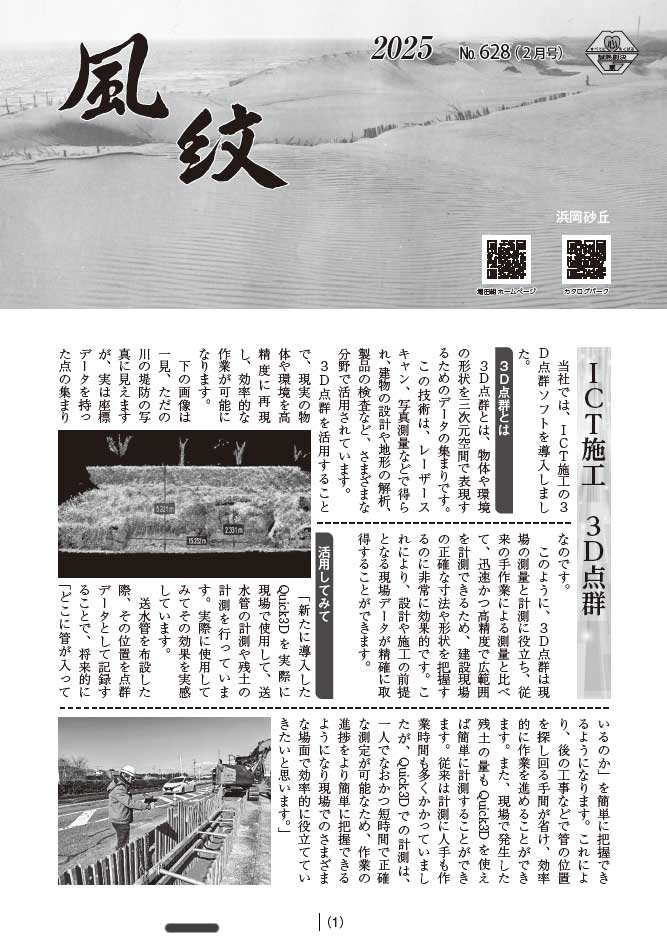 2025年2月1日 / 最終更新日 : 2026年1月6日 ex 新着情報 風紋2月号(No,628)をアップしました! 風紋2月号を見る 社内報一覧ページを見る 弊社の社内報、風紋2月(No,628)をアップしました。 風紋2月号(No,628)ダイジェスト ICT施工 3D点群 新年の抱負 新年安全祈願祭・仕事始めの式 世の中拝見 道路啓かい訓練 新入社員紹介 インフルエンザ注意 FacebookXBlueskyHatenaCopy