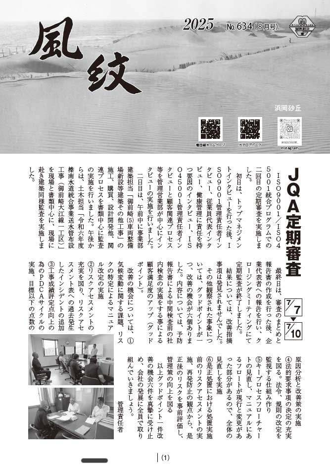 2025年8月1日 / 最終更新日 : 2026年1月6日 ex 新着情報 風紋8月号(No,634)をアップしました! 風紋8月号を見る 社内報一覧ページを見る 弊社の社内報、風紋8月(No,634)をアップしました。 風紋8月号(No,634)ダイジェスト JQA定期審査 全国安全週間 健康経営セミナー 健康ワンポイントアドバイス あなたの伴走者 つぶやき 安全標語優秀賞をいただきました 浜岡中学校職業講話 FacebookXBlueskyHatenaCopy